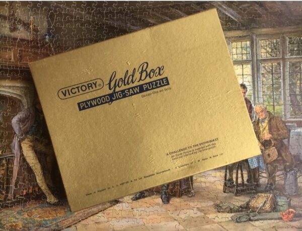 A Tall Story’ is a vintage Victory ‘Gold Box’ wooden jigsaw puzzle containing 800 pieces. This wooden jigsaw puzzle includes over 30 ‘whimsy’ (specially shaped) pieces and measures 24″ x 19.5″ (61 x 50cm).As with all jigsaw puzzles in the Victory ‘Gold Box’ series, this puzzle comes without a guide picture making it a real challenge to complete. (The second photo shows the completed puzzle).The puzzle pieces are in excellent condition and the colours are still vibrant. A few of the pieces have very small pin holes but they are barely noticeable. (These pin holes are where the jigsaw puzzle was held in place during the cutting process).The box is in excellent condition with only very slight wear.Condition: