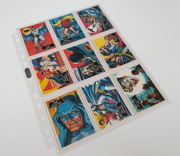 Batman ‘Black Bat’ Gum Cards – Topps (A&BC) Deluxe Reissue Set from 1989.This set comprises a complete set of 55 cards which are a deluxe reprint of the set issued in the 1960’s to tie in with the Batman TV series.All of the cards are in mint condition are are stored in Ultra-Pro Platinum acid-free pocket pages, as pictured, whch are also included with the set.Condition: