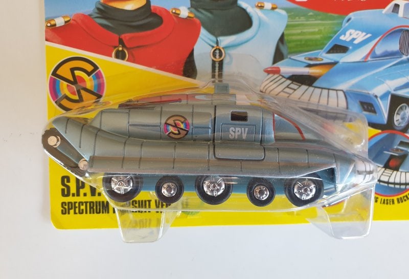 This detailed diecast model of the Captain Scarlet S.P.V. (Spectrum Pursuit Vehicle) was issued in 1993 to coincide with the re-run of the Gerry Anderson ‘Captain Scarlet’ 1960’s TV show.This model, which is similar to a smaller version of the 1960’s Dinky 104 S.P.V. diecast model, features retractable aerials and rear tracks, ejector seat and a front-firing rocket.The model we currently have for sale (pictured on this page) comes from a one-owner collection and is unopened and in ‘as new’ condition.Additional photographs are available on request.Scale: Approx. 1:43Length of model: 15cmIssue date: 1993Manufacturer: Vivid ImaginationsCondition: