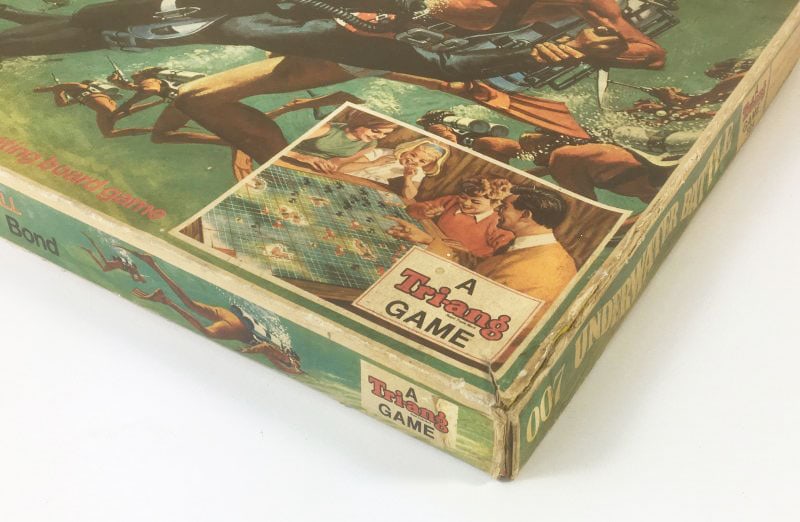 James Bond ‘007 Underwater Battle’ board game was published by Triang in the 1960’s to tie in with the release of the ‘Thunderball’ film and is now very collectable – and very rare!The game recreates the climatic underwater battle between the Largo and his henchmen, who are trying to plant bombs to blow up Miami, and James Bond and his team who are trying to intercept them.The Largo player must try and get the bombs, carried aboard a mini-submarine, from his boat (the Disco Volante) to Miami, and the James Bond player must try to intercept the bombs and get them safely aboard a U.S. warship moored off the coast.This game is now very rare and extremely collectable. The combination of a relatively expensive price tag, a large fragile box, and lots of detailed playing peices, meant that the game didn’t sell in huge numbers and the playing peices were easily damaged or lost, so complete games are now very hard to find.The game we currently have for sale, pictured on this page, is in average condition but it does have all of the original playing pieces (frogmen, James Bond, Largo etc.) and apart from minor damage (broken spear gun tips) to 3 frogmen, the playing pieces are undamaged.Some of the stands for the playing pieces are replacements (see photos).The box is in average condition with some storage and age-related wear but is useable. Contents: